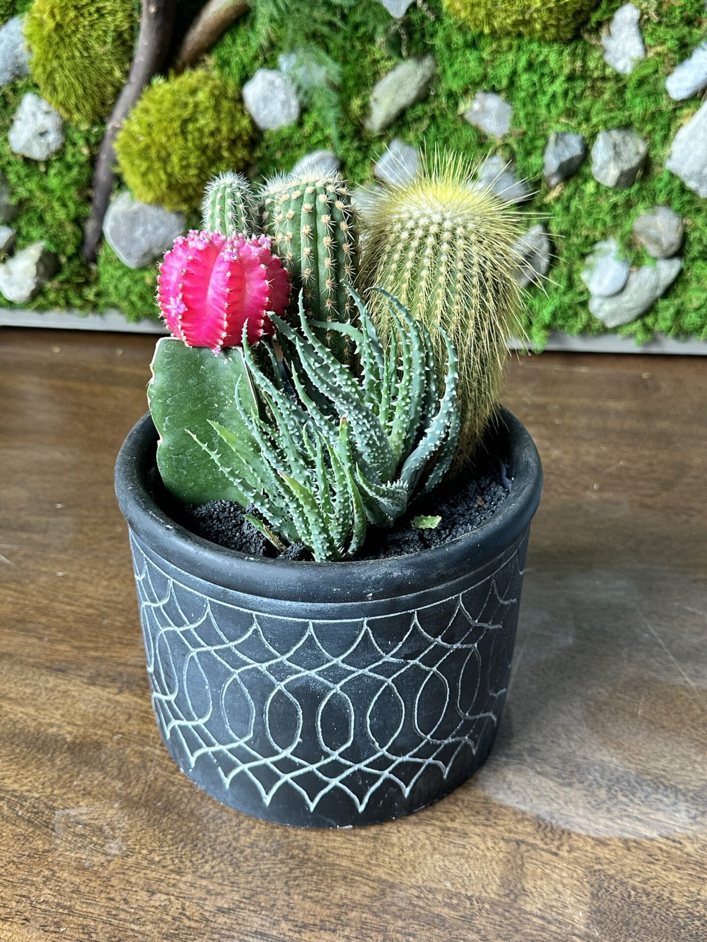The collection of cacti featured in a minimalist black planter, is easiest to care for – watering once a month with plenty of light. The cacti might bloom once they well adjusted and happy with their placement. Thoughtful gift for any space at home or in an office.